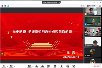王岩教授从“学史明理”的核心理念出发,沿着“十月革命”、五四运动、中国共产党成立的时间线循序渐进地阐释了“没有共产党就没有新中国”的历史原因,并由此说明了意识形态在历史发展及当前时代发展中的重要作用。首先,王教授以“何为意识形态”展开话题,指出意识形态作为建立在一定经济基础之上的观念上层建筑,它具有阶级利益维护功能、批判性功能和整合性功能、现实导向和理想追求的功能,而意识形态工作又是党的一项极端重要工作,能否做好意识形态工作,事关党的前途命运和国家的长治久安。接着,王岩教授从十个方面重点阐释了当前我国意识形态热点和前沿问题。第一,坚持党的集中统一领导。坚持党的集中统一领导,必须牢记党政军民学,东西南北中,党领导一切,唯有如此,才能确保党始终总揽全局、协调各方,发挥出中国特色社会主义制度的最大优势。第二,坚持中国特色社会主义道路。走自己的路,是党的全部理论和实践的立足点,更是百年奋斗得出的历史结论。第三,当代中国的历史方位问题。正处于“两个一百年”的历史交汇期的中国,新的战略布局已经形成,要把握好当前中国所处的历史方位。第四,坚持以人民为中心的百年传承。中国共产党始终坚定人民立场,坚持人民至上,把人民群众放在心中最高位置,将以人民为中心的发展思想百年传承。第五,坚持公有制为主体。我国必须始终坚持以公有制经济为主体、多种所有制经济共同发展的基本经济制度不动摇。第六,走共同富裕之路。共同富裕是社会主义的本质规定和奋斗目标,也是我国社会主义的根本原则,我们必须坚持走共同富裕之路。第七,新发展理念的创新发展。创新是历史进步的动力、时代发展的关键。面对今日世界,只有把创新发展放在我国发展全局的核心位置,才能适应和引领时代发展大势。第八,新时代的伟大斗争。在新时代的伟大斗争和未来的中国经济社会中,始终统筹好高质量的发展和国家整体安全。第九,人类共同价值。中国作为国际社会中负责任大国形象,将继续弘扬和平、发展、公平、正义、民主、自由的全人类共同价值。第十,树立党史观。我们要认清历史虚无主义及其本质,树立正确的党史观,面对西方不良社会思潮的冲击时坚定毫不动摇的党史信念。最后,王岩教授强调,对于意识形态问题的研究,我们需要具备充分的国际视野和追问意识,及时学习相关政策和会议精神,做到深入挖掘并理性思考。