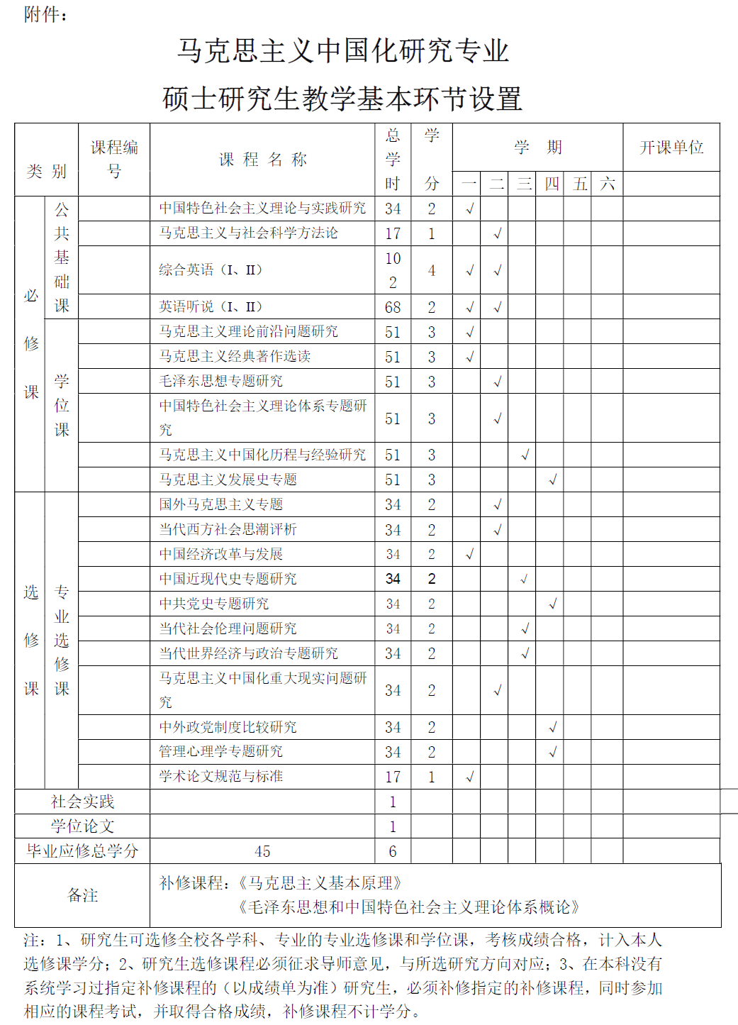 注:每位硕士研究生必须按照各教学基本环节规定的学分进行必修或选修,且每一环节的学分不得用其它环节的学分替代,修满的总学分为45。