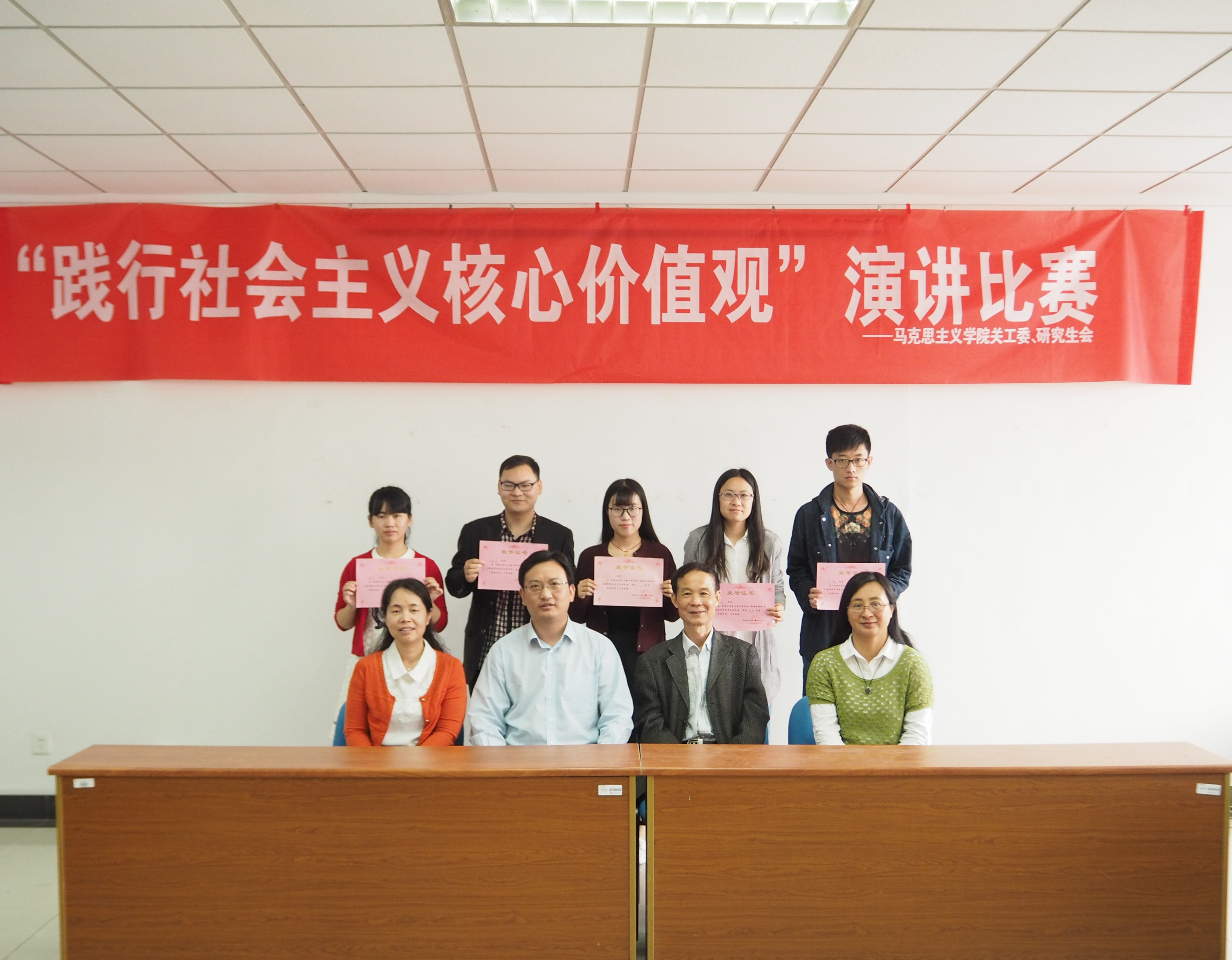 关工委在院会议室举办了以“弘扬社会主义核心价值观构建和谐校园”为主题的演讲比赛。院关工委副主任谢树放教授、关工委委员张妍老师、研究生秘书陶蓉老师担任评委,院党总支书记、关工委主任殷建新出席了此次活动并为获奖选手颁奖。