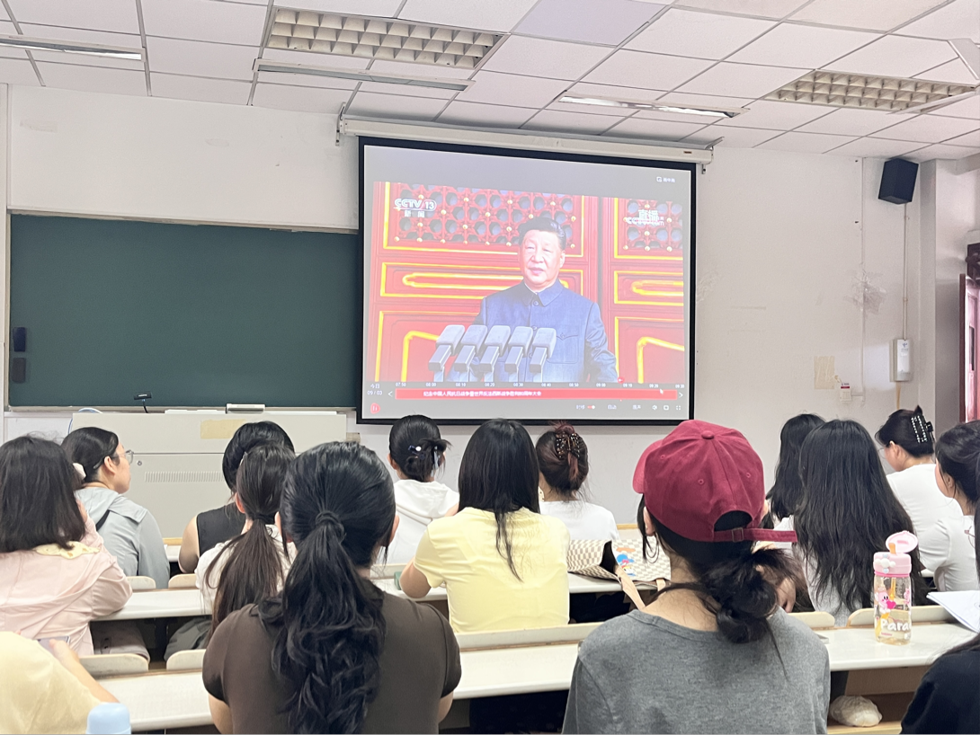师生于德正楼204教室集中观看纪念中国人民抗日战争暨世界反法西斯战争胜利80周年大会直播。